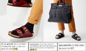 4."Birkinstocks": 고가의 Hermes Birkin 가방을 재활용하여 만든 샌들로, 럭셔리 아이템에 대한 소비 문화를 풍자합니다.
